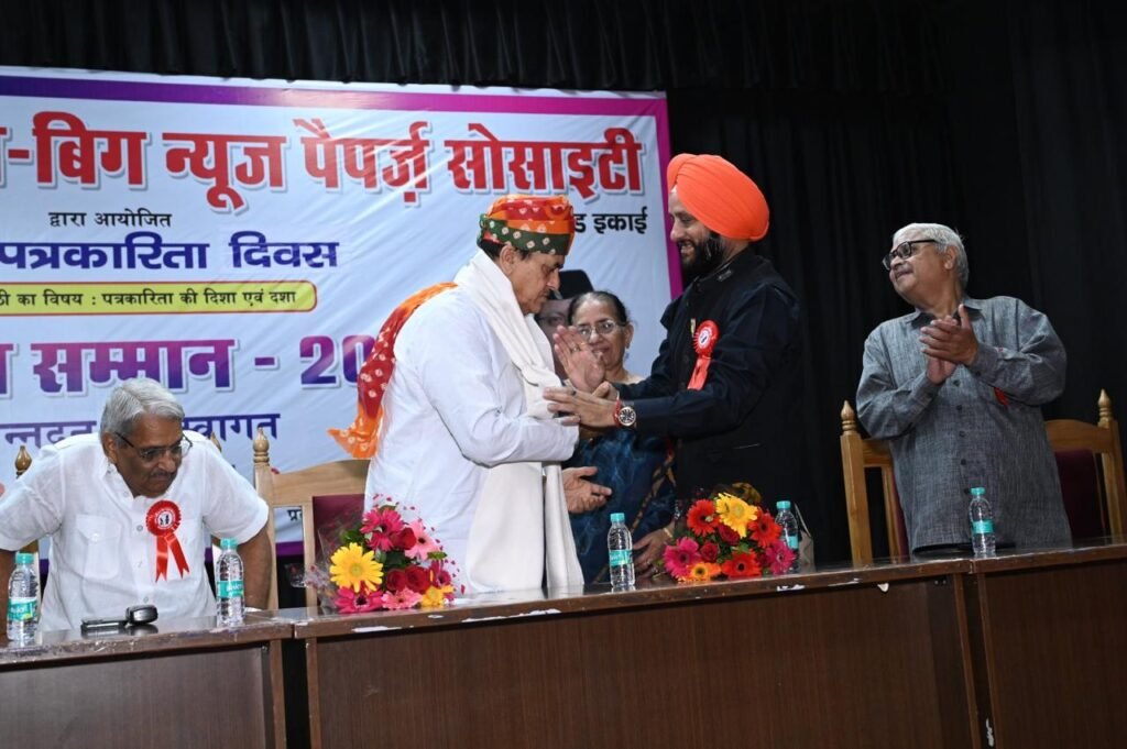 Senior Journalist Dr. L.C. Bhartiya – Member Press Council of India, Government of India presenting Maharana Pratap Award to Mr. Deepak Singh – General Secretary, Small Medium Big Newspaper Society Small–Medium–Big Newspapers Society Hindi Patrakarita Divas